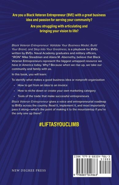 Are you a Black Veteran Entrepreneur (BVE) with a great business idea and passion for serving your community? Are you struggling with articulating and bringing your vision to life? Black Veteran Entrepreneur: Validate Your Business Model, Build Your Brand, and Step Into Your Greatness, is a playbook for BVEs written by BVEs. Naval Academy graduates and military officers, "IRON" Mike Steadman and Alana M. Abernethy, believe that Black Veteran Entrepreneurs represent the biggest untapped resource we have in America today. Why? Because when we rise up, we take our community and family with us. In this book, you will learn:To identify what makes a good business idea or nonprofit organization How to get from an idea to an invoice How to niche down or create your own marketing category Tools of the trade that make successful entrepreneurs Black Veteran Entrepreneur gives a voice and entrepreneurial roadmap to BVEs across the country. Read it, implement it, and, most importantly, pass it along-what's the point of making it to the mountaintop if you're the only one up there? ¿#LiftAsYouClimb