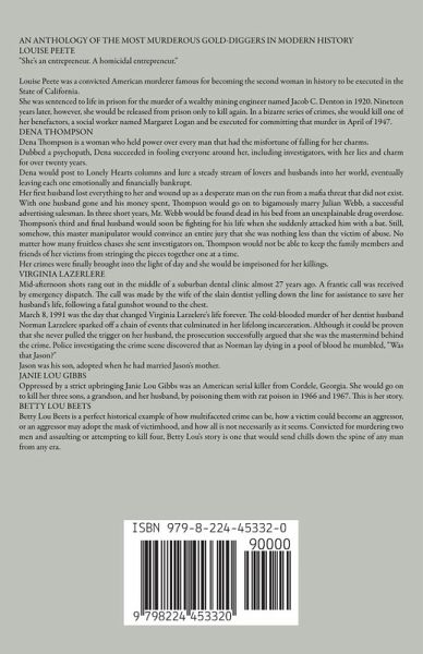 AN ANTHOLOGY OF THE MOST MURDEROUS GOLD-DIGGERS IN MODERN HISTORY LOUISE PEETE "She's an entrepreneur. A homicidal entrepreneur." Louise Peete was a convicted American murderer famous for becoming the second woman in history to be executed in the State of California. She was sentenced to life in prison for the murder of a wealthy mining engineer named Jacob C. Denton in 1920. Nineteen years later, however, she would be released from prison only to kill again. In a bizarre series of crimes, she would kill one of her benefactors, a social worker named Margaret Logan and be executed for committing that murder in April of 1947. DENA THOMPSON Dena Thompson is a woman who held power over every man that had the misfortune of falling for her charms. Dubbed a psychopath, Dena succeeded in fooling everyone around her, including investigators, with her lies and charm for over twenty years. Dena would post to Lonely Hearts columns and lure a steady stream of lovers and husbands into her world, eventually leaving each one emotionally and financially bankrupt. Her first husband lost everything to her and wound up as a desperate man on the run from a mafia threat that did not exist. With one husband gone and his money spent, Thompson would go on to bigamously marry Julian Webb, a successful advertising salesman. In three short years, Mr. Webb would be found dead in his bed from an unexplainable drug overdose. Thompson's third and final husband would soon be fighting for his life when she suddenly attacked him with a bat. Still, somehow, this master manipulator would convince an entire jury that she was nothing less than the victim of abuse. No matter how many fruitless chases she sent investigators on, Thompson would not be able to keep the family members and friends of her victims from stringing the pieces together one at a time. Her crimes were finally brought into the light of day and she would be imprisoned for her killings. VIRGINIA LAZERLERE Mid-afternoon shots rang out in the middle of a suburban dental clinic almost 27 years ago. A frantic call was received by emergency dispatch. The call was made by the wife of the slain dentist yelling down the line for assistance to save her husband's life, following a fatal gunshot wound to the chest. March 8, 1991 was the day that changed Virginia Larzelere's life forever. The cold-blooded murder of her dentist husband Norman Larzelere sparked off a chain of events that culminated in her lifelong incarceration. Although it could be proven that she never pulled the trigger on her husband, the prosecution successfully argued that she was the mastermind behind the crime. Police investigating the crime scene discovered that as Norman lay dying in a pool of blood he mumbled, "Was that Jason?" Jason was his son, adopted when he had married Jason's mother. JANIE LOU GIBBS Oppressed by a strict upbringing Janie Lou Gibbs was an American serial killer from Cordele, Georgia. She would go on to kill her three sons, a grandson, and her husband, by poisoning them with rat poison in 1966 and 1967. This is her story. BETTY LOU BEETS Betty Lou Beets is a perfect historical example of how multifaceted crime can be, how a victim could become an aggressor, or an aggressor may adopt the mask of victimhood, and how all is not necessarily as it seems. Convicted for murdering two men and assaulting or attempting to kill four, Betty Lou's story is one that would send chills down the spine of any man from any era.