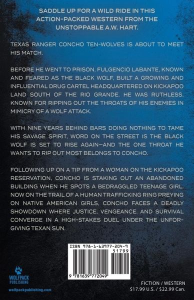 SADDLE UP FOR A WILD RIDE IN THIS ACTION-PACKED WESTERN FROM THE UNSTOPPABLE A.W. HART. Texas Ranger Concho Ten-Wolves is about to meet his match. Before he went to prison, Fulgencio Labante, known and feared as The Black Wolf, built a growing and influential drug cartel headquartered on Kickapoo land south of the Rio Grande. He was ruthless, known for ripping out the throats of his enemies in mimicry of a wolf attack. With nine years behind bars doing nothing to tame his savage spirit, word on the street is The Black Wolf is set to rise again-and the one throat he wants to rip out most belongs to Concho. Following up on a tip from a woman on the Kickapoo Reservation, Concho is staking out an abandoned building when he spots a bedraggled teenage girl. Now on the trail of a human trafficking ring preying on Native American girls, Concho faces a deadly showdown where justice, vengeance, and survival converge in a high-stakes duel under the unforgiving Texan sun.