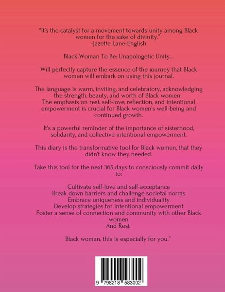 "It's the catalyst for a movement towards unity among Black women for the sake of divinity." - Jazette Lane-English Black Woman To Be: Unapologetic Unity... Will perfectly capture the essence of the journey that Black women will embark on using this journal. The language is warm, inviting, and celebratory, acknowledging the strength, beauty, and worth of Black women. The emphasis on rest, self-love, reflection, and intentional empowerment is crucial for Black women's well-being and continued growth. It's a powerful reminder of the importance of sisterhood, solidarity, and collective intentional empowerment. This diary is the transformative tool for Black women, that they didn't know they needed. Take this tool for the next 365 days to consciously commit daily to: - Cultivate self-love and self-acceptance - Break down barriers and challenge societal norms - Embrace uniqueness and individuality - Develop strategies for intentional empowerment - Foster a sense of connection and community with other Black women -And Rest Black woman, this is especially for you.