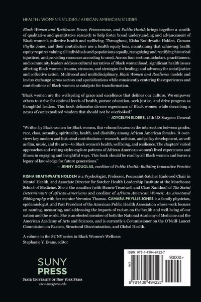 Black Women and Resilience brings together a wealth of qualitative and quantitative research to help foster broad understanding and advancement of Black women's collective health and wellbeing. Throughout, Kisha Braithwaite Holden, Camara Phyllis Jones, and their contributors use a health equity lens, maintaining that achieving health equity requires valuing all individuals and populations equally, recognizing and rectifying historical injustices, and providing resources according to need. Across four sections, scholars, practitioners, and community leaders address cultural narratives of Black womanhood; significant health issues affecting Black women; trauma, stressors, and strategies for healing; and advocacy for social justice and collective action. Multivocal and multidisciplinary, Black Women and Resilience models and invites exchange across sectors and specializations while consistently centering the experiences and contributions of Black women as catalysts for transformation.