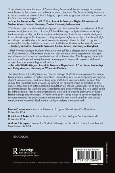 The latest book in the Key Issues on Diverse College Students series explores the state of Black women students in higher education. Delineating key issues, proposing an original student success model, and describing what institutions can do to better support this group, this important book provides a succinct but comprehensive exploration of this underrepresented and often neglected population on college campuses. Full of practical recommendations for working across academic and student affairs, this is a useful guide for administrators, faculty, and practitioners interested in creating pathways for Black female college student success. Whether this book is read cover to cover or used as a resource manual, the pages contain critical insights that should be taken into serious consideration wherever Black women college students are concerned.