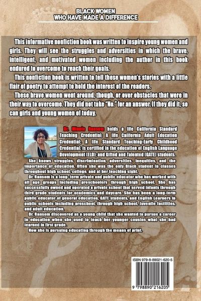 This informative nonfiction book was written to inspire young women and girls. They will see the struggles and adversities in which the brave, intelligent, and motivated women including the author in this book endured to overcome to reach their goals. This nonfiction book is written to tell these women's stories with a little flair of poetry to attempt to hold the interest of the readers. These brave women went around, though, or over obstacles that were in their way to overcome. They did not take "No." for an answer. If they did it, so can girls and young women of today.