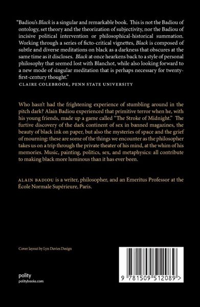 "Badiou's Black is a singular and remarkable book. This is not the Badiou of ontology, set theory and the theorization of subjectivity, nor the Badiou of incisive political intervention or philosophical-historical summation. Working through a series of ficto-critical vignettes, Black is composed of subtle and diverse meditations on black as a darkness that obscures at the same time as it discloses. Black at once hearkens back to a style of personal philosophy that seemed lost with Blanchot, while also looking forward to a new mode of singular meditation that is perhaps necessary for twenty-first-century thought."