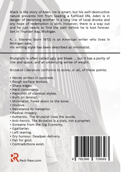 Black is a Brutalist Novel. It is the story of Aden. He is smart, but his self-destructive nature prevents him from leading a fulfilled life. Aden is in danger of becoming another in a long line of local drunks and any hope of redemption is slim. However, there is a way out and he just needs to find the path before he is lost forever. Set in Thunder Bay, Michigan.