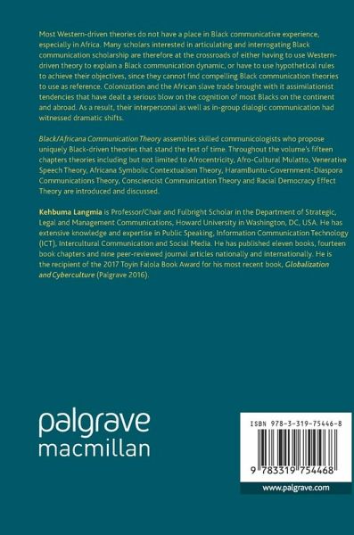 1. Introduction (Kehbuma Langmia).-Part I Afrocentric Communication Theories.- 2. The Classical African Concept of Maat and Human Communication (Molefi Kete Asante).- 3. Cognitive Hiatus and the White Validation Syndrome: An Afrocentric Analysis (Ama Mazama).- Part II Africana Communication Theories.- 4. Igbo Communication Styles: Conceptualizing Ethnic Communication Theory (Uchenna Onuzulike).- 5. Kuelekea Nadharia Ujamaa Mawasiliano: Toward a Familyhood Communication Theory (Abdul Karim Bangura).- 6. Afro-Cultural Mulatto Communication Theory (Kehbuma Langmia).- 7. Venerative Speech Theory and African Communalism: A Geo-Cultural Perspective (Bala A. Musa).- 8. Africana Symbolic Contextualism Theory (Faith Nguru and Agnes Lucy Lando).- 9. The HaramBuntu-Government-Diaspora Relationship Management Theory (Stella-Monica N. Mpande).- 10. Dynamism:N'digbo and Communication in Post-Modernism (Chuka Onwumechili).- 11. Consciencist Communication Theory: Expanding the Epistemology on Nkrumahism (Abdul Karim Bangura).- Part III African American Communication Theories.- 12. Afrocentricity of the Whole: Bringing Women and LGBTQIA Voices in from the Theoretical Margins (Natalie Hopkinson and Taryn K. Myers).- 13. New Frames: A Pastiche of Theoretical Approaches to Examine African American and Diasporic Communication (Gracie Lawson-Borders).- Part IV Latin America & Caribbean Communication Theories.- 14. Creolized Media Theory: An Examination of Local Cable Television in Jamaica as Hybrid Upstarts (Nickesia S. Gordon).- 15.Caribbean Communication: Social Mediation Through the Caribbean ICTVirtual Community (CIVIC) (Roger Caruth).- 16. Color Privileges, Humor, and Dialogues: Theorizing How People of African Descent in Brazil Communicatively Manage Stigmatization and Racial Discrimination (Juliana Maria da Silva Trammel).