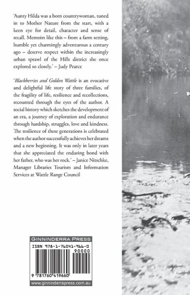 'Aunty Hilda was a born countrywoman, tuned in to Mother Nature from the start, with a keen eye for detail, character and sense of recall. Memoirs like this - from a farm setting, humble yet charmingly adventurous a century ago - deserve respect within the increasingly urban sprawl of the Hills district she once explored so closely. ' - Judy Pearce 'Blackberries and Golden Wattle is an evocative and delightful life story of three families, of the fragility of life, resilience and recollections, recounted through the eyes of the author. A social history which sketches the development of an era, a journey of exploration and endurance through hardship, struggles, love and kindness. The resilience of these generations is celebrated when the author successfully achieves her dreams and a new beginning. It was only in later years that she appreciated the enduring bond with her father, who was her rock.' - Janice Nitschke, Manager Libraries Tourism and Information Services at Wattle Range Council