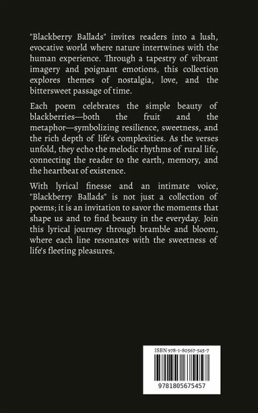 "Blackberry Ballads" invites readers into a lush, evocative world where nature intertwines with the human experience. Through a tapestry of vibrant imagery and poignant emotions, this collection explores themes of nostalgia, love, and the bittersweet passage of time. Each poem celebrates the simple beauty of blackberries-both the fruit and the metaphor-symbolizing resilience, sweetness, and the rich depth of life's complexities. As the verses unfold, they echo the melodic rhythms of rural life, connecting the reader to the earth, memory, and the heartbeat of existence. With lyrical finesse and an intimate voice, "Blackberry Ballads" is not just a collection of poems; it is an invitation to savor the moments that shape us and to find beauty in the everyday. Join this lyrical journey through bramble and bloom, where each line resonates with the sweetness of life's fleeting pleasures.