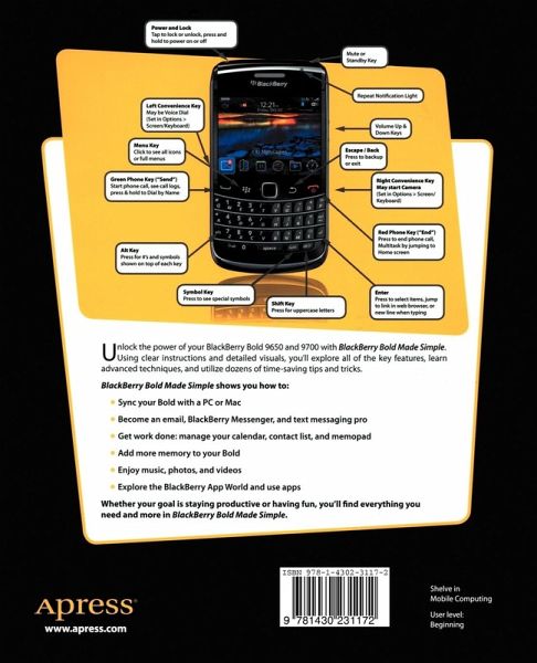 BlackBerry Bold Made Simple teaches you how to get the most out of your BlackBerry Bold. You'll explore all the features and uncover time-saving techniques-from emailing and scheduling to video recording and expanding memory-all through easy-to-read instructions and detailed visuals. Written by two successful BlackBerry trainers and authors, this is simply the most comprehensive and clear guidebook to the BlackBerry Bold available.