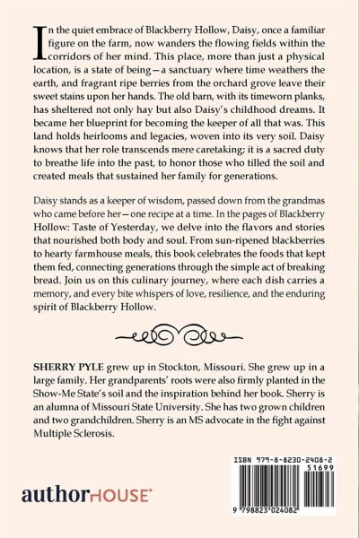 In the quiet embrace of Blackberry Hollow, Daisy, once a familiar figure on the farm, now wanders the flowing fields within the corridors of her mind. This place, more than just a physical location, is a state of being-a sanctuary where time weathers the earth, and fragrant ripe berries from the orchard grove leave their sweet staines upon her hands. The old barn, with its timeworn planks, has sheltered not only hay but also Daisy's childhood dreams. It became her blueprint for becoming the keeper of all that was. This land holds heirlooms and legacies, woven into its very soil. Daisy knows that her role transcends mere caretaking; it is a sacred duty to breathe life into the past, to honor those who tilled the soil and created meals that sustained her family for generations. Daisy stands as a keeper of wisdom, passed down from the grandmas who came before her-one recipe at a time. In the pages of Blackberry Hollow: Taste of Yesterday, we delve into the flavors and stories that nourished both body and soul. From sun-ripened blackberries to hearty farmhouse meals, this book celebrates the foods that kept them fed, connecting generations through the simple act of breaking bread. Join us on this culinary journey, where each dish carries a memory, and every bite whispers of love, resilience, and the enduring spirit of Blackberry Hollow.