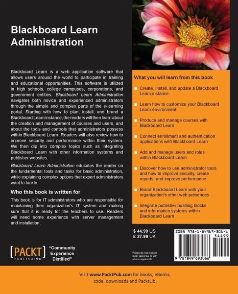 Blackboard Learn is web application software that allows users around the world to participate in training and educational opportunities. This software is utilized in high schools, college campuses, corporations, and government entities. 'Blackboard Learn Administration' navigates both novice and experienced administrators through the simple and complex parts of the e-Learning portal. Readers go step-by-step with the author from planning and installing a Blackboard Learn instance to supporting and administrating a system with courses and users.