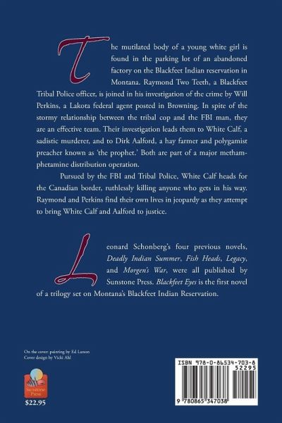 The mutilated body of a young white girl is found in the parking lot of an abandoned factory on the Blackfeet Indian reservation in Montana. Raymond Two Teeth, a Blackfeet Tribal Police officer, is joined in his investigation of the crime by Will Perkins, a Lakota federal agent posted in Browning. In spite of the stormy relationship between the tribal cop and the FBI man, they are an effective team. Their investigation leads them to White Calf, a sadistic murderer, and to Dirk Aalford, a hay farmer and polygamist preacher known as 'the prophet.' Both are part of a major methamphetamine distribution operation. Pursued by the FBI and Tribal Police, White Calf heads for the Canadian border, ruthlessly killing anyone who gets in his way. Raymond and Perkins find their own lives in jeopardy as they attempt to bring White Calf and Aalford to justice. Leonard Schonberg's four previous novels, "Deadly Indian Summer," "Fish Heads," "Legacy," and "Morgen's War," were all published by Sunstone Press. "Blackfeet Eyes" is the first novel of a trilogy set on Montana's Blackfeet Indian Reservation.