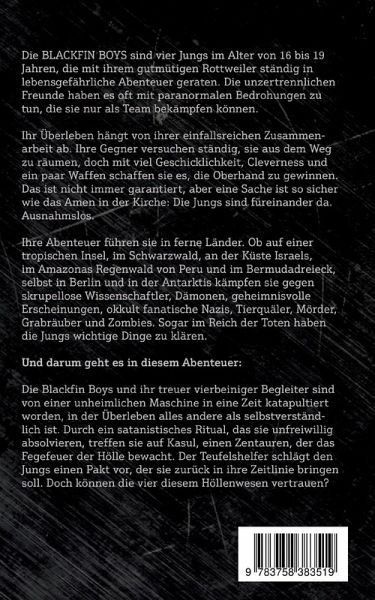 Die Blackfin Boys sind vier Jungs im Alter von 16 bis 19 Jahren, die mit ihrem gutmütigen Rottweiler ständig in lebensgefährliche Abenteuer geraten. Die unzertrennlichen Freunde haben es oft mit paranormalen Bedrohungen zu tun, die sie nur als Team bekämpfen können. Ihr Überleben hängt von ihrer einfallsreichen Zusammenarbeit ab. Ihre Gegner versuchen ständig, sie aus dem Weg zu räumen, doch mit viel Geschicklichkeit, Cleverness und ein paar Waffen schaffen sie es, die Oberhand zu gewinnen. Das ist nicht immer garantiert, aber eine Sache ist so sicher wie das Amen in der Kirche: Die Jungs sind füreinander da. Ausnahmslos.Ihre Abenteuer führen sie in ferne Länder. Ob auf einer tropischen Insel, im Schwarzwald, an der Küste Israels, im Amazonas Regenwald von Peru und im Bermudadreieck, selbst in Berlin und in der Antarktis kämpfen sie gegen skrupellose Wissenschaftler, Dämonen, geheimnisvolle Erscheinungen, okkult fanatische Nazis, Tierquäler, Mörder, Grabräuber und Zombies (die, die schneller laufen können). Sogar im Reich der Toten haben die Jungs wichtige Dinge zu klären.Und darum geht es in diesem Abenteuer:Die Blackfin Boys und ihr treuer vierbeiniger Begleiter sind von einer unheimlichen Maschine in eine Zeit katapultiert worden, in der Überleben alles andere als selbstverständlich ist. Durch ein satanistisches Ritual, das sie unfreiwillig absolvieren, treffen sie auf Kasul, einen Zentauren, der das Fegefeuer der Hölle bewacht. Der Teufelshelfer schlägt den Jungs einen Pakt vor, der sie zurück in ihre Zeitlinie bringen soll. Doch können die vier diesem Höllenwesen vertrauen?