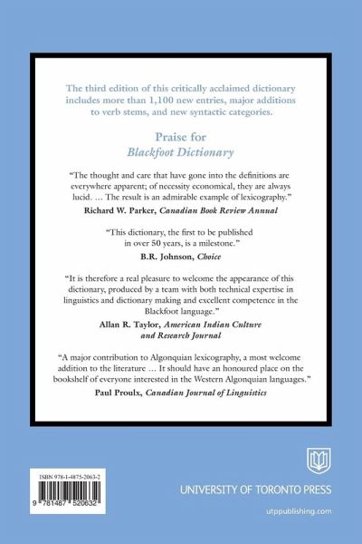 The Blackfoot Dictionary is a comprehensive guide to the vocabulary of Blackfoot, an Algonquian language spoken by thousands in Alberta and Montana. This third edition of the critically acclaimed dictionary adds more than 1,100 new entries, major additions to verb stems, and the inclusion of vai, vii, vta, and viti syntactic categories. It contains more than 5,500 Blackfoot-English entries and an English index of more than 6,000 entries, and provides thorough coverage of cultural terms. The transcription uses an official, technically accurate alphabet and the authors have classified entries and selected examples based on more than 46 years of research.