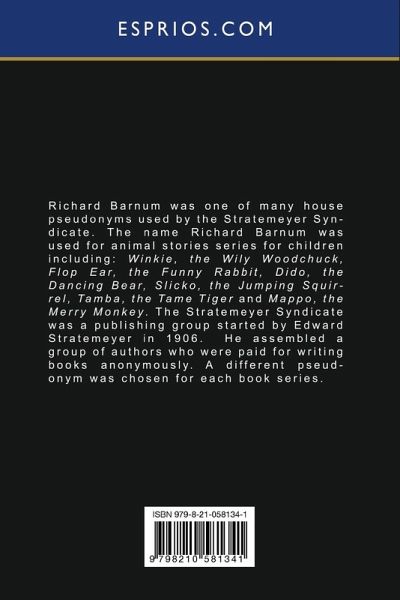 Richard Barnum was one of many house pseudonyms used by the Stratemeyer Syndicate. The name Richard Barnum was used for animal stories series for children including: Winkie, the Wily Woodchuck, Flop Ear, the Funny Rabbit, Dido, the Dancing Bear, Slicko, the Jumping Squirrel, Tamba, the Tame Tiger and Mappo, the Merry Monkey. The Stratemeyer Syndicate was a publishing group started by Edward Stratemeyer in 1906. He assembled a group of authors who were paid for writing books anonymously. A different pseudonym was chosen for each book series.