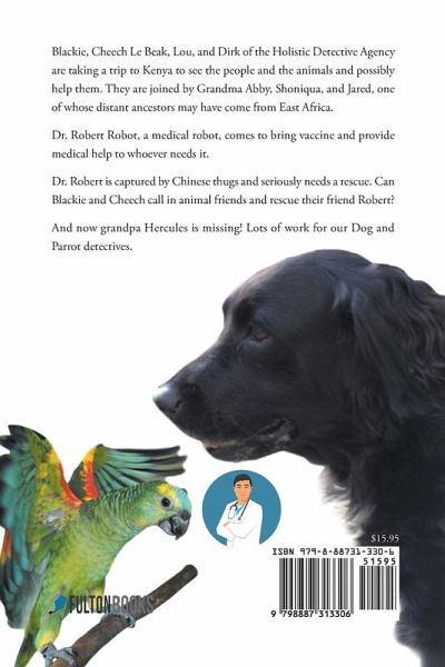 Blackie, Cheech Le Beak, Lou, and Dirk of the Holistic Detective Agency are taking a trip to Kenya to see the people and the animals and possibly help them. They are joined by Grandma Abby, Shoniqua, and Jared, one of whose distant ancestors may have come from East Africa. Dr. Robert Robot, a medical robot, comes to bring vaccine and provide medical help to whoever needs it. Dr. Robert is captured by Chinese thugs and seriously needs a rescue. Can Blackie and Cheech call in animal friends and rescue their friend Robert? And now grandpa Hercules is missing! Lots of work for our Dog and Parrot detectives.