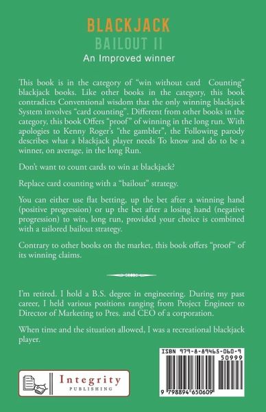 This book is in the category of "win without card Counting" blackjack books. Like other books in the category, this book contradicts Conventional wisdom that the only winning blackjack System involves "card counting". Different from other books in the category, this book Offers "proof" of winning in the long run. With apologies to Kenny Roger's "the gambler", the Following parody describes what a blackjack player needs To know and do to be a winner, on average, in the long Run. Don't want to count cards to win at blackjack? Replace card counting with a "bailout" strategy. You can either use flat betting, up the bet after a winning hand (positive progression) or up the bet after a losing hand (negative progression) to win, long run, provided your choice is combined with a tailored bailout strategy. Contrary to other books on the market, this book offers "proof" of its winning claims.