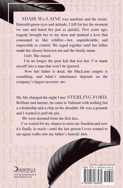 Adair MacLaine was sunshine and the storm. Emerald-green eyes and attitude, I fell for her the moment we met and hated her just as quickly. Five years ago, tragedy brought her to my door and sparked a love that consumed us like wildfire-hot, unpredictable, and impossible to control. We raged together until her father made her choose between me and the family name. I left. She stayed. I'm no longer the poor kid that lost her. I've made myself into a man that won't be ignored. Now her father is dead, the MacLaine empire is crumbling, and Adair's inheritance depends on the company's largest investor: me. *** ¿ My whole life changed the night I met Sterling Ford. Brilliant and intense, he came to Valmont with nothing but a scholarship and a chip on his shoulder. He was a grenade and I wanted to pull the pin. We were doomed from the first kiss. I've waited for my chance to seize my freedom and now it's finally in reach-until the last person I ever wanted to see again walks into my father's funeral: him. From New York Times bestselling author Geneva Lee comes the first chapter in an emotional, breathtaking love story that will leave you obsessed and begging for more.