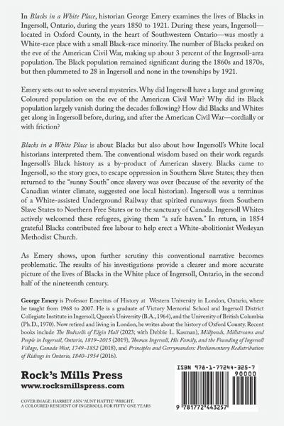 In Blacks in a White Place, historian George Emery examines the lives of Blacks in Ingersoll, Ontario, during the years 1850 to 1921.During these years, Ingersoll---located in Oxford County, in the heart of Southwestern Ontario---was mostly a White-race place with a small Black-race minority. The number of Blacks peaked on the eve of the American Civil War, making up about 3 percent of the Ingersoll-area population. The Black population remained significant during the 1860s and 1870s, but then plummeted to 28 in Ingersoll and none in the townships by 1921. Emery sets out to solve several mysteries. Why did Ingersoll have a large and growing Coloured population on the eve of the American Civil War? Why did its Black population largely vanish during the decades following? How did Blacks and Whites get along in Ingersoll before, during, and after the American Civil War---cordially or with friction? Blacks in a White Place is about Blacks but also about how Ingersoll's White local historians interpreted them. The conventional wisdom based on their work regards Ingersoll's Black history as a by-product of American slavery before the Civil War and its abolition in 1863. Blacks came to Ingersoll, so the story goes, to escape oppression in Southern Slave States; they then returned to the "sunny South" once slavery was over (because of the severity of the Canadian winter climate, suggests one local historian). Ingersoll was a terminus of a White-assisted Underground Railway that spirited runaways from Southern Slave States to Northern Free States or to the sanctuary of Canada. Ingersoll Whites actively welcomed these refugees, giving them "a safe haven." In return, in 1854 grateful Blacks contributed free labour to help erect a White-abolitionist Wesleyan Methodist Church. As Emery shows, upon further scrutiny this conventional narrative becomes problematic. The results of his investigations provide a clearer and more accurate picture of the lives of Blacks in the White place of Ingersoll, Ontario, in the second half of the nineteenth century.