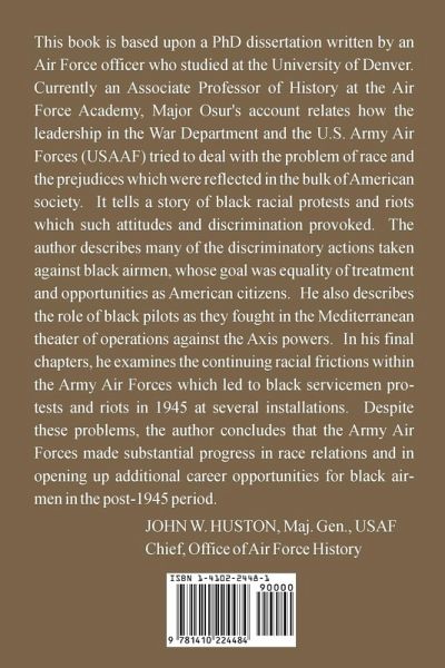 This book is based upon a PhD dissertation written by an Air Force officer who studied at the University of Denver. Currently an Associate Professor of History at the Air Force Academy, Major Osur's account relates how the leadership in the War Department and the U.S. Army Air Forces (USAAF) tried to deal with the problem of race and the prejudices which were reflected in the bulk of American society. It tells a story of black racial protests and riots which such attitudes and discrimination provoked. The author describes many of the discriminatory actions taken against black airmen, whose goal was equality of treatment and opportunities as American citizens. He also describes the role of black pilots as they fought in the Mediterranean theater of operations against the Axis powers. In his final chapters, he examines the continuing racial frictions within the Army Air Forces which led to black servicemen protests and riots in 1945 at several installations. Despite these problems, the author concludes that the Army Air Forces made substantial progress in race relations and in opening up additional career opportunities for black airmen in the post-1945 period. JOHN W. HUSTON, Maj. Gen., USAF Chief, Office of Air Force History