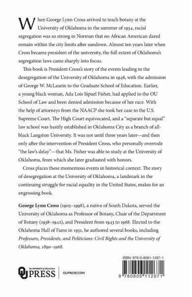 When George Lynn Cross arrived to teach botany at the University of Oklahoma in the summer of 1934, racial segregation was so strong in Norman that no African American dared remain within the city limits after sundown. Almost ten years later when Cross became president of the university, the full extent of Oklahoma's segregation laws came sharply into focus. This book is President Cross's story of the events leading to the desegregation of the University of Oklahoma in 1948, with the admission of George W. McLaurin to the Graduate School of Education. Earlier, a young black woman, Ada Lois Sipuel Fisher, had applied to the OU School of Law and been denied admission because of her race. With the help of attorneys from the NAACP she took her case to the U.S. Supreme Court. The High Court equivocated, and a "separate but equal" law school was hastily established in Oklahoma City as a branch of all-black Langston University. It was not until three years later-and then only after the intervention of President Cross, who personally overrode "the law's delay"-that Ms. Fisher was able to study at the University of Oklahoma, from which she later graduated with honors. Cross places these momentous events in historical context. The story of desegregation at the University of Oklahoma, a landmark in the continuing struggle for racial equality in the United States, makes for an engrossing book. George Lynn Cross (1905-1998), a native of South Dakota, served the University of Oklahoma as Professor of Botany, Chair of the Department of Botany (1938-1942), and President from 1943 to 1968. Elected to the Oklahoma Hall of Fame in 1951, he authored several books, including Professors, Presidents, and Politicians: Civil Rights and the University of Oklahoma, 1890-1968.