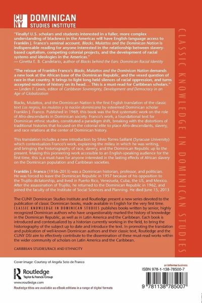 Blacks, Mulattos, and the Dominican Nation is the first English translation of the classic text Los negros, los mulatos y la nación dominicana by esteemed Dominican scholar Franklin J. Franco. Published in 1969, this book was the first systematic work on the role of Afro-descendants in Dominican society, the first society of the modern Americas where a Black-Mulatto population majority developed during the 16th century. Franco's work, a foundational text for Dominican ethnic studies, constituted a paradigm shift, breaking with the distortions of traditional histories that focused on the colonial elite to place Afro-descendants, slavery, and race relations at the center of Dominican history. This translation includes a new introduction by Silvio Torres-Saillant (Syracuse University) which contextualizes Franco's work, explaining the milieu in which he was writing, and bringing the historiography of race, slavery, and the Dominican Republic up to the present. Making this pioneering work accessible to an English-speaking audience for the first time, this is a must-have for anyone interested in the lasting effects of African slavery on the Dominican population and Caribbean societies.