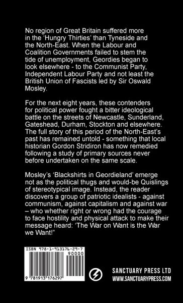 No region of Great Britain suffered more in the 'Hungry Thirties' than Tyneside and the North-East. When the Labour and Coalition Governments failed to stem the tide of unemployment, Geordies began to look elsewhere - to the Communist Party, Independent Labour Party and not least the British Union of Fascists led by Sir Oswald Mosley. For the next eight years, these contenders for political power fought a bitter ideological battle on the streets of Newcastle, Sunderland, Gateshead, Durham, Stockton and elsewhere. The full story of this period of the North-East's past has remained untold - something that local historian Gordon Stridiron has now remedied following a study of primary sources never before undertaken on the same scale. Mosley's 'Blackshirts in Geordieland' emerge not as the political thugs and would-be Quislings of stereotypical image. Instead, the reader discovers a group of patriotic idealists - against communism, against capitalism and against war - who whether right or wrong had the courage to face hostility and physical attack to make their message heard: 'The War on Want is the War we Want!"