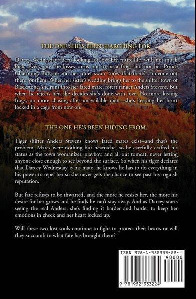 The one she's been searching for Darcey Wednesday's been looking for love her entire life, with not much luck. Every guy she kisses turns out to be a frog, and not her Prince Charming. But she and her inner swan know that there's someone out there for them. When her sister's wedding brings her to the shifter town of Blackstone, she runs into her fated mate, forest ranger Anders Stevens. But when he rejects her, she decides she's done looking for love. No more kissing frogs, no more chasing after unavailable men--she's keeping her heart locked in a cage from now on. The one he's been hiding from Tiger shifter Anders Stevens knows fated mates exist--and that's the problem. Mates were nothing but heartache, so he carefully crafted his status as the town womanizer, playboy, and all out tomcat, never letting anyone close enough to see beyond the surface. So when his tiger declares that Darcey Wednesday is his mate, he knows he has to do everything in his power to repel her so she never gets the chance to see past his roguish reputation. But fate refuses to be thwarted, and the more he resists her, the more his desire for her grows and he finds he can't stay away. And as Darcey starts seeing the real Anders, she's finding it harder and harder to keep her emotions in check and her heart locked up. Will these two lost souls continue to fight to protect their hearts or will they succumb to what fate has brought them?