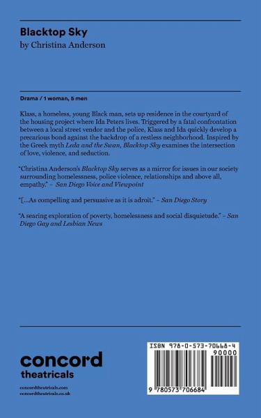 Klass, a homeless, young Black man, sets up residence in the courtyard of the housing project where Ida Peters lives. Triggered by a fatal confrontation between a local street vendor and the police, Klass and Ida quickly develop a precarious bond against the backdrop of a restless neighborhood. Inspired by the Greek myth Leda and the Swan, Blacktop Sky examines the intersection of love, violence, and seduction.
