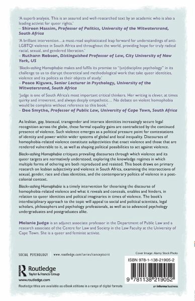 Blackwashing Homophobia is a timely intervention for theorising the discourse of homophobia-related violence and what it reveals and conceals, enables and hinders, in relation to queer identities and political imaginaries in times of violence. The book's interdisciplinary approach to the topic will appeal to social and political scientists, philosophers and psychology professionals, as well as to advanced psychology undergraduates and postgraduates alike.
