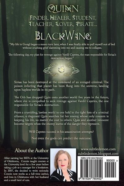 Quin: Finder, healer, student, teacher, lover, pirate- BlackWing "My life in Gungl began a moon-turn later, when I was finally able to pull myself out of bed without crushing grief slamming into me and causing me to collapse. The following day, my plan for revenge against Vardil Cayetes, the man responsible for Siriaa's destruction, began." * * *Siriaa has been destroyed at the command of an enraged criminal. The poison infecting that planet has been flung into the universe, landing upon hapless worlds in its path. The Orb has dropped Quin onto another world five years in the future, where she is compelled to seek revenge against Vardil Cayetes, the one responsible for Siriaa's destruction. From a crumbling, lawless world to one held in the tight fists of a criminal alliance, a disguised Quin searches for her enemy, whose only concern is keeping his life, no matter the cost to others. Quin and another innocent become targets when the enemy learns of the danger they represent. Will Cayetes succeed in his assassination attempts? Not even the gods can predict the outcome.