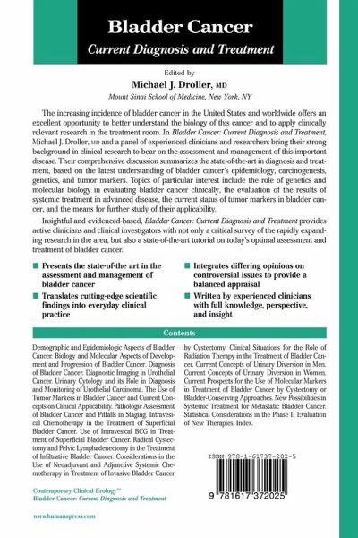Michael J. Droller, MD and a panel of experienced clinicians bring their strong background in clinical research to bear on the assessment and management of bladder cancer. Their comprehensive discussion summarizes the state-of-the-art in diagnosis and treatment, based on the latest understanding of bladder cancer's epidemiology, carcinogenesis, and tumor markers. Topics of particular interest include the role of genetics and molecular biology in evaluating bladder cancer clinically, the evaluation of the results of systemic treatment in advanced disease, the current status of tumor markers in bladder cancer, and the means for further study in their applicability. Insightful and evidenced-based, Bladder Cancer: Current Diagnosis and Treatment provides active clinicians and clinical investigators with not only a critical survey of the rapidly expanding research in the area, but also a state-of-the-art tutorial on today's optimal assessment and treatment of bladder cancer.