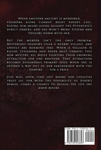 When another ancient is murdered, Lyssandra alone cannot resist Asher's call. Aiding him means going against the Potentate's direct orders, and she won't bring Steifan and Tholdri down with her. But the murder isn't the only problem. Mysterious shadows stalk a nearby village, and ghouls are roaming free. When a villager is killed, Lyssandra and Asher must unravel this new mystery, all while fighting their growing attraction for one another. That attraction becomes Lyssandra's primary issue when she is offered a way out of her partnership with the vampire . . . for a price. Lyss will soon find out where her loyalties truly lie, for with the possibility of Asher's demise, comes a chance to regain the life she knew before.