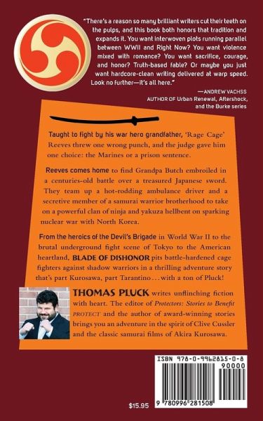 A centuries-old battle between ninja and samurai over a stolen sword... enter 'Rage Cage' Reeves! Taught to fight by his war hero grandfather, Reeves comes home to find Grandpa Butch embroiled in a centuries-old battle over a treasured Japanese sword. Together they team up with Tara the hot-rodding ambulance driver and a secretive member of a samurai warrior brotherhood to take on a powerful clan of ninja and yakuza bent on sparking a third world war. From the heroics of the Devil's Brigade in World War II and the brutal underground fight scene of Tokyo to the American heartland, BLADE OF DISHONOR pits battle-hardened cage fighters against cunning shadow warriors in a thrilling adventure story that's part Kurosawa and part Tarantino ... with a ton of Pluck!
