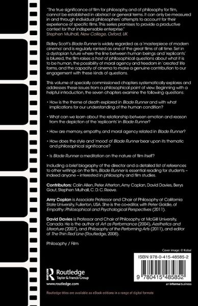 1. Introduction Amy Coplan and David Davies 2. Elegy in LA: Blade Runner, empathy, and death Berys Gaut 3. 'More human than human': Blade Runner and being-toward-death Peter Atterton 4. Replicant love: Blade Runner Voight-Kampffed C. D. C. Reeve 5. Do humans dream of emotional machines? Colin Allen 6. Zhora through the looking-glass: notes on an esper analysis of Leon's photograph Stephen Mulhall 7. In the mood for thought: mood and meaning in Ridley Scott's Blade Runner Amy Coplan 8. Blade Runner and the cognitive values of cinema David Davies. Index