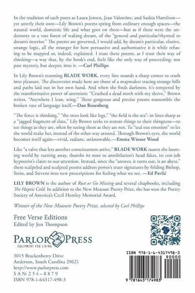 Winner of the New Measures Poetry Prize Free Verse Editions What People Are Saying In the tradition of such poets as Laura Jensen, Jean Valentine, and Saskia Hamilton-yet utterly their own-Lily Brown's poems spring from ordinary enough spaces-the natural world, domestic life and what goes on there-but as if these were the understory to a vast forest of waking dream, of the "general and particular/rhymed to dream's interior." The poems are governed, I would add, by dream's particular, elusive, strange logic, all the stranger for how persuasive and authoritative it is while refusing to be mapped or, indeed, explained. I trust these poems, as I trust their way of thinking-a way that, by the book's end, feels like the only way of proceeding: not past mystery, but deeper, into it. -Carl Phillips In Lily Brown's stunning Blade Work, every line rounds a sharp corner to crash into pleasure. The discoveries made here are those of a mapmaker tracing strange hills and paths laid out in her own hand. And when she finds darkness, it's tempered by the transformative power of attention: "Crushed a dead moth with my sleeve," Brown writes. "Anywhere I lean, wing." These gorgeous and precise poems reassemble the broken vase of language itself.-Dan Rosenberg "The fence is thinking," "the trees look like legs," "the field is the sea": in lines sharp as a "jagged fragment of slate," Lily Brown seeks to restore things to their thingness-to see things as they are, often by seeing them as they are not. To "seal out emotion" to let the world make her, instead of the other way around. Through Brown's eyes, the world becomes itself again-vivid, radiant, unknowable.-Emma Winsor Wood As AI-powered media mirrors chart a billion blinks, scan each eye for its next fear, its secret desire, as power fans out in a zillion-swarm of amoeba drones, the poems in Lily Brown's Blade Work turn our eyes to other and othered elements: sky, cloud, wind, river, dream. Here sets a "semi-automatic sun," there "a building's touch gives the wind its pitch." Like "a valve that lets another consciousness arrive," Blade Work taunts the looming world by turning away, thumbs its nose to annihilation's head fakes, its con-job hypnotist's claim to our attention. Instead, since the "answer, it turns out, is an abyss," these scalpeled and sculpted poems address power's truer signatures by folding Bishop, Stein, and Stevens into new prescriptions for feeling what we see. The clarity here hovers inside a spiritual crisis locked inside global material catastrophe; the authority claims, even flaunts, an impossibility of achieved precision like "glass bent in a storm/of sun." -Ed Pavli¿ About the Author Lily Brown is the author of Rust or Go Missing and several chapbooks, including The Haptic Cold. In addition to the New Measure Poetry Prize, she has won the Poetry Society of America's Cecil Hemley Memorial Award and has been awarded residencies at Arte Studio Ginistrelle, the Vermont Studio Center, and the UCross Foundation.