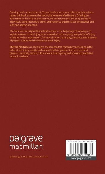 Based on true accounts from people of different ages and backgrounds who have self harmed, Theresa McShane's recent book Blades, Blood and Bandages offers new perspectives on this very difficult issue. Using the theoretical framework of 'trajectories of suffering' and analysing the ritual aspects and the long-term impact of the actual acts of self harm, McShane offers the professional and the lay reader new ways of understanding both the act and the person who performs the act of self harm." - Dr Pauline Prior, Queen's University, Belfast