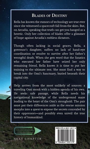 Rella has known the rumors of technology are true ever since she witnessed a spacecraft fall from the skies. But, on Arcadia, speaking that truth can get you hanged as a heretic. Only her collection of blades offer a glimmer of hope against Arcadia's ruthless dictators. Though often lacking in social graces, Rella, a governor's daughter, suffers no lack of hand-eye coordination or resolve to survive after her father's wrongful death. When she gets word that the fanatics who executed her father have seized her only remaining friend, Rella knows it is time to put her training to the ultimate test. She must find a way to break into the Omi's Sanctuary, buried beneath their capital city. Help arrives from the most unlikely of sources: a traveling Omi monk with a hidden agenda of his own. He seeks safe passage, while Rella needs his navigational knowledge of the underground maze leading to the heart of the Omi's stronghold. The pair must put their differences aside as the rescue mission morphs into a quest to expose the secrets concealed by their oppressors-and possibly even unveil the true history of humankind.