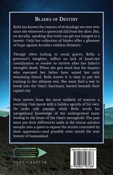 Rella has known the rumors of technology are true ever since she witnessed a spacecraft fall from the skies. But, on Arcadia, speaking that truth can get you hanged as a heretic. Only her collection of blades offer a glimmer of hope against Arcadia's ruthless dictators. Though often lacking in social graces, Rella, a governor's daughter, suffers no lack of hand-eye coordination or resolve to survive after her father's wrongful death. When she gets word that the fanatics who executed her father have seized her only remaining friend, Rella knows it is time to put her training to the ultimate test. She must find a way to break into the Omi's Sanctuary, buried beneath their capital city. Help arrives from the most unlikely of sources: a traveling Omi monk with a hidden agenda of his own. He seeks safe passage, while Rella needs his navigational knowledge of the underground maze leading to the heart of the Omi's stronghold. The pair must put their differences aside as the rescue mission morphs into a quest to expose the secrets concealed by their oppressors-and possibly even unveil the true history of humankind.
