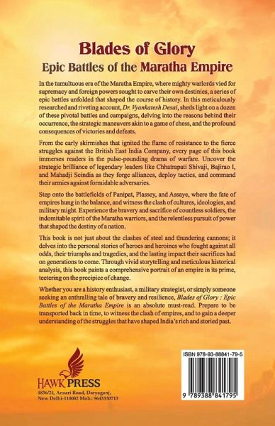 In the tumultuous era of the Maratha Empire, where mighty warlords vied for supremacy and foreign powers sought to carve their own destinies, a series of epic battles unfolded that shaped the course of history. In this meticulously researched and riveting account, Dr. Vyankatesh Desai, sheds light on a dozen of these pivotal battles and campaigns, delving into the reasons behind their occurrence, the strategic maneuvers akin to a game of chess, and the profound consequences of victories and defeats. From the early skirmishes that ignited the flame of resistance to the fierce struggles against the British East India Company, every page of this book immerses readers in the pulse-pounding drama of warfare. Uncover the strategic brilliance of legendary leaders like Chhatrapati Shivaji, Bajirao I, and Mahadji Scindia as they forge alliances, deploy tactics, and command their armies against formidable adversaries. Step onto the battlefields of Panipat, Plassey, and Assaye, where the fate of empires hung in the balance, and witness the clash of cultures, ideologies, and military might. Experience the bravery and sacrifice of countless soldiers, the indomitable spirit of the Maratha warriors, and the relentless pursuit of power that shaped the destiny of a nation. This book is not just about the clashes of steel and thundering cannons; it delves into the personal stories of heroes and heroines who fought against all odds, their triumphs and tragedies, and the lasting impact their sacrifices had on generations to come. Through vivid storytelling and meticulous historical analysis, this book paints a comprehensive portrait of an empire in its prime, teetering on the precipice of change. Whether you are a history enthusiast, a military strategist, or simply someone seeking an enthralling tale of bravery and resilience, Blades of Glory : Epic Battles of the Maratha Empire is an absolute must-read. Prepare to be transported back in time, to witness the clash of empires, and to gain a deeper understanding of the struggles that have shaped India's rich and storied past.