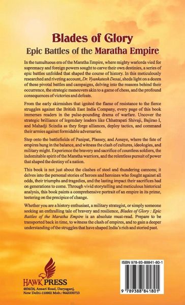 In the tumultuous era of the Maratha Empire, where mighty warlords vied for supremacy and foreign powers sought to carve their own destinies, a series of epic battles unfolded that shaped the course of history. In this meticulously researched and riveting account, Dr. Vyankatesh Desai, sheds light on a dozen of these pivotal battles and campaigns, delving into the reasons behind their occurrence, the strategic maneuvers akin to a game of chess, and the profound consequences of victories and defeats. From the early skirmishes that ignited the flame of resistance to the fierce struggles against the British East India Company, every page of this book immerses readers in the pulse-pounding drama of warfare. Uncover the strategic brilliance of legendary leaders like Chhatrapati Shivaji, Bajirao I, and Mahadji Scindia as they forge alliances, deploy tactics, and command their armies against formidable adversaries. Step onto the battlefields of Panipat, Plassey, and Assaye, where the fate of empires hung in the balance, and witness the clash of cultures, ideologies, and military might. Experience the bravery and sacrifice of countless soldiers, the indomitable spirit of the Maratha warriors, and the relentless pursuit of power that shaped the destiny of a nation. This book is not just about the clashes of steel and thundering cannons; it delves into the personal stories of heroes and heroines who fought against all odds, their triumphs and tragedies, and the lasting impact their sacrifices had on generations to come. Through vivid storytelling and meticulous historical analysis, this book paints a comprehensive portrait of an empire in its prime, teetering on the precipice of change. Whether you are a history enthusiast, a military strategist, or simply someone seeking an enthralling tale of bravery and resilience, Blades of Glory : Epic Battles of the Maratha Empire is an absolute must-read. Prepare to be transported back in time, to witness the clash of empires, and to gain a deeper understanding of the struggles that have shaped India's rich and storied past.