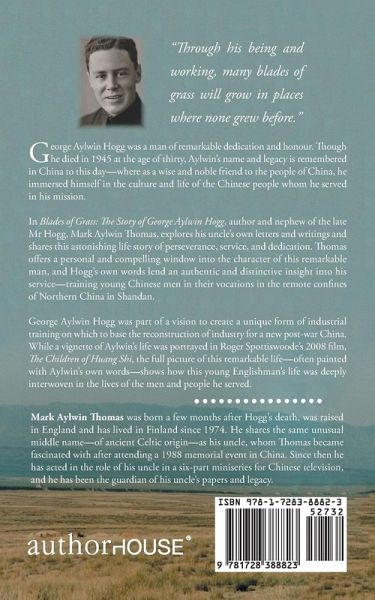 George Aylwin Hogg was a man of remarkable dedication and honour. Though he died in 1945 at the age of thirty, Aylwin's name and legacy is remembered in China to this day-where as a wise and noble friend to the people of China, he immersed himself in the culture and life of the Chinese people whom he served in his mission. In Blades of Grass: The Story of George Aylwin Hogg, author and nephew of the late Mr Hogg, Mark Aylwin Thomas, explores his uncle's own letters and writings and shares this astonishing life story of perseverance, service, and dedication. Thomas offers a personal and compelling window into the character of this remarkable man, and Hogg's own words lend an authentic and distinctive insight into his service-training young Chinese men in their vocations in the remote confines of Northern China in Shandan. George Aylwin Hogg was part of a vision to create a unique form of industrial training on which to base the reconstruction of industry for a new post-war China. While a vignette of Aylwin's life was portrayed in Roger Spottiswoode's 2008 film, The Children of Huang Shi, the full picture of this remarkable life-often painted with Aylwin's own words-shows how this young Englishman's life was deeply interwoven in the lives of the men and people he served.