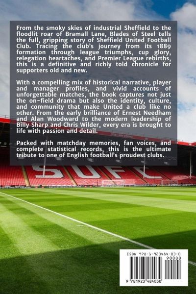 From the smoky skies of industrial Sheffield to the floodlit roar of Bramall Lane, Blades of Steel tells the full, gripping story of Sheffield United Football Club. Tracing the club's journey from its 1889 formation through league triumphs, cup glory, relegation heartaches, and Premier League rebirths, this is a definitive and richly told chronicle for supporters old and new. With a compelling mix of historical narrative, player and manager profiles, and vivid accounts of unforgettable matches, the book captures not just the on-field drama but also the identity, culture, and community that make United a club like no other. From the early brilliance of Ernest Needham and Alan Woodward to the modern leadership of Billy Sharp and Chris Wilder, every era is brought to life with passion and detail. Packed with matchday memories, fan voices, and complete statistical records, this is the ultimate tribute to one of English football's proudest clubs.
