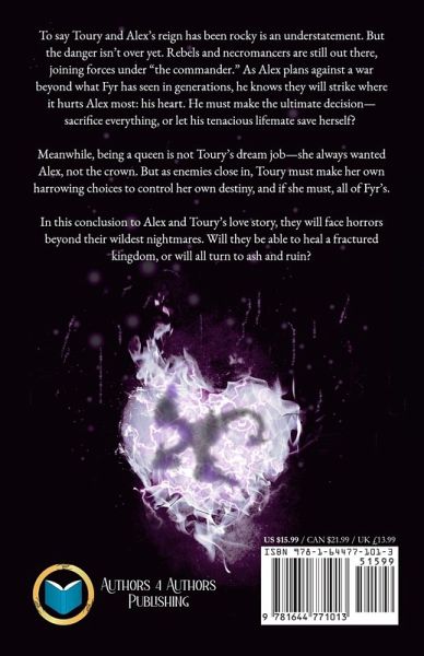 To say Toury and Alex's reign has been rocky is an understatement. But the danger isn't over yet. Rebels and necromancers are still out there, joining forces under "the commander." As Alex plans against a war beyond what Fyr has seen in generations, he knows they will strike where it hurts Alex most: his heart. He must make the ultimate decision-sacrifice everything, or let his tenacious lifemate save herself? Meanwhile, being a queen is not Toury's dream job-she always wanted Alex, not the crown. But as enemies close in, Toury must make her own harrowing choices to control her own destiny, and if she must, all of Fyr's. In this conclusion to Alex and Toury's love story, they will face horrors beyond their wildest nightmares. Will they be able to heal a fractured kingdom, or will all turn to ash and ruin? Authors 4 Authors Content Rating This title has been rated 17+, appropriate for older teens and adults, and contains:moderate language frequent intense violence intense implied sex mild alcohol use domestic abuse forced abortion forced marriage attempted suicide For more information on our rating system, please, visit our Content Guide at: www.authors4authorspublishing.com/books/ratings