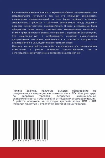 V knige podcherkiwaetsq wazhnost' izucheniq osobennostej priwqzannosti i ämocional'nogo intellekta, tak kak äto otkrywaet wozmozhnost' optimizacii wzaimootnoshenij za schet bolee glubokogo osoznaniq ämocional'nyh processow i sostoqnij, woznikaüschih mezhdu lüd'mi w processe mezhlichnostnogo wzaimodejstwiq. V hode issledowaniq byli obnaruzheny swqzi mezhdu komponentami ämocional'nom intellekte, stilem priwqzannosti w blizkih otnosheniqh i ocenkoj ih blagopoluchiq. Jeto swidetel'stwuet o neobhodimosti snizheniq wyrazhennosti destruktiwnyh patternow priwqzannosti w kontexte supruzheskogo wzaimodejstwiq s cel'ü dostizheniq garmonii w pare.Nadeüs', chto moq rabota mozhet byt' ispol'zowana kak prakticheskimi psihologami w ramkah semejnogo konsul'tirowaniq, tak i neposredstwennymi uchastnikami semejnogo wzaimodejstwiq.