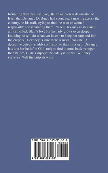 Reuniting with his lost love, Blair Campion is devastated to learn that Devaney Daubney had spent years moving across the country, on his trail, trying to find the man or woman responsible for separating them. When Devaney is shot and almost killed, Blair’s love for his lady grows even deeper, knowing he will do whatever he can to keep her safe and find the culprits. Devaney is sure there is more than one. A deceptive detective adds confusion to their mystery. Devaney has lost her belief in God, only to find it come back stronger than before, Blair’s support the catalyst to this. Will they survive? Will the culprits win?