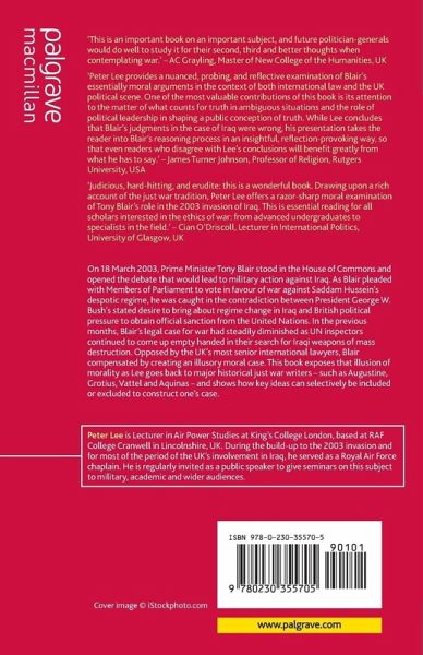'Peter Lee provides a nuanced, probing, and reflective examination of Blair's essentially moral arguments in the context of both international law and the UK political scene. One of the most valuable contributions of this book is its attention to the matter of what counts for truth in ambiguous situations and the role of political leadership in shaping a public conception of truth. While Lee concludes that Blair's judgments in the case of Iraq were wrong, his presentation takes the reader into Blair's reasoning process in an insightful, reflection-provoking way, so that even readers who disagree with Lee's conclusions will benefit greatly from what he has to say.' James Turner Johnson, Professor of Religion, Rutgers University, USA