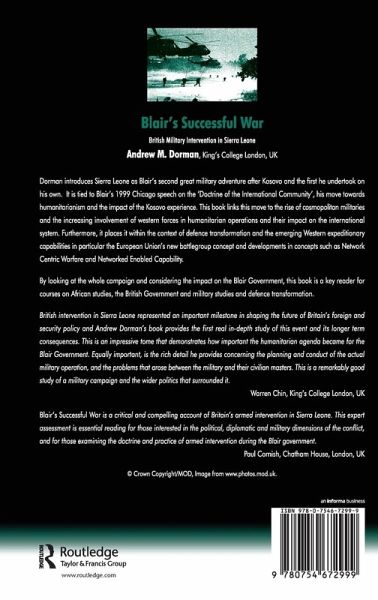 Andrew Dorman introduces Sierra Leone as Blair's second great military adventure after Kosovo and the first he undertook on his own. It is tied to Blair's 1999 Chicago speech on the 'Doctrine of the International Community', his move towards humanitarianism and the impact of the Kosovo experience. The book links this move with the rise of cosmopolitan militaries and the increasing involvement of Western forces in humanitarian operations and their impact on the international system. Furthermore, it places it within the context of defence transformation and the emerging Western expeditionary capabilities, in particular the European Union's new battle group concept and developments in concepts such as Network Centric Warfare and Networked Enabled Capability. Examining the whole campaign and considering the impact on the Blair Government, this book will prove to be a key reader on the topic.