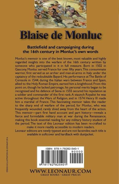 Battlefield and campaigning during the 16th century in Monluc’s own words Monluc’s memoir is one of the best known, most valuable and highly regarded insights into the warfare of the 16th century written by someone who participated in it in full measure. Born in 1502 in Gascony, Monluc served France for over fifty years. This consummate warrior, first served as an archer and man-at-arms in Italy under the captaincy of the redoubtable Bayard. His performance at The Battle of Ceresole in 1544, during the Italian wars between France and Spain, allied to the Holy Roman Empire, earned him a knighthood. From this point on, though he lacked patronage, his personal merits began to be recognised and his defence of Siena in 1555 secured his reputation as a soldier and commander of the first rank. A staunch Royalist he was active throughout the Wars of Religion, and in 1574 Henry III made him a marshal of France. This fascinating memoir takes the reader to the sharp end of warfare of the period, for Monluc, who was frequently wounded, rarely shied away from the heart of the action. This memoir—part first hand account and part history—reveals a fierce and formidable military man at war during the Renaissance, making this book essential reading for any military history student of the period. The text of this Leonaur edition has been re-crafted to make it more readily accessible to modern readers. Leonaur editions are newly typeset and are not facsimiles; each title is available in softcover and hardback with dustjacket.