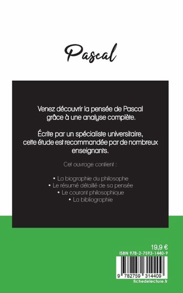 Venez découvrir la pensée de Pascal grâce à une analyse philosophique de référence ! Écrite par un spécialiste universitaire, cette étude est recommandée par de nombreux enseignants. Cet ouvrage contient notamment la biographie du philosophe, le résumé détaillé de sa pensée, ainsi que l'analyse de son courant philosophique. Retrouvez tous nos titres sur : www.fichedelecture.fr.